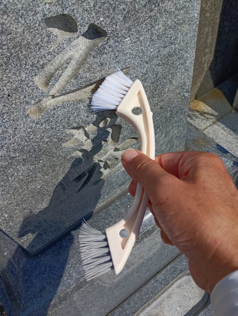 お墓参りで、竿石や墓誌の文字のところのコケや黒いカビ汚れは取れていますか。タオルやスポンジではなかなか取れません。使い古した歯ブラシだとプラスチック部分が石に当たって清掃しにくい。そんな時は、このダブルブラシが大変便利です。ハケの大きさ長さも違うため、文字の大きさと彫りの深さによっても使い分けられます。100円ショップでも販売しています。是非お勧めの一品です。