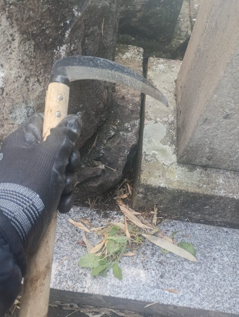 年末年始のお墓参りの予定はいかがですか。防寒対策と、水を使うのでゴム手袋を忘れないで下さいね。便利な道具の第3弾です。お墓参りの清掃の時に、隣のお墓との隙間の枯れ草等の取り除きはどうしてますか。私は家で使っていなかった草刈り鎌を使用しています。狭い隙間の清掃に威力を発揮します。竹の葉っぱや枯れ草を掻き出すのに便利です。雑草を根っこから抜くときにも使えますし、刃の背の部分でコンクリート路のコケの剝がしにも使っています。ホームセンターでは数百円で販売しています。ただし、刃物ですから持ち運びの時はさやに入れること、使用時は手袋が必須です。注意してお使いください。